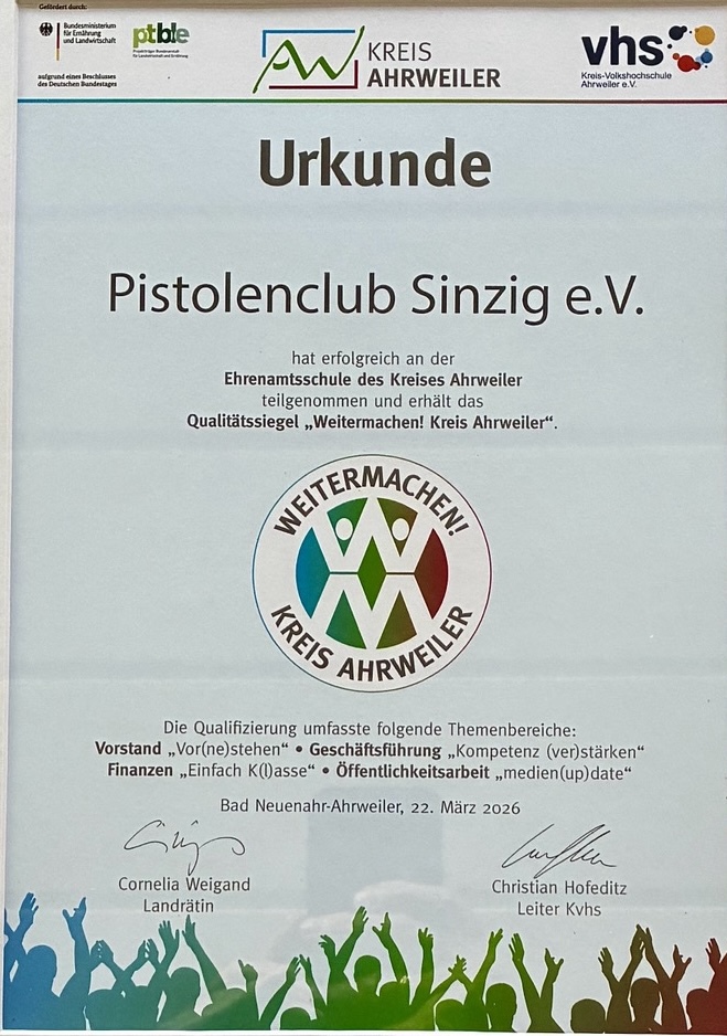 Der Verein hat im Frühjahr erfolgreich an der Ehrenamtsschule des Kreises Ahrweiler teilgenommen und erhält das Qualitätssiegel "Weitermachen Kreis Ahrweiler".